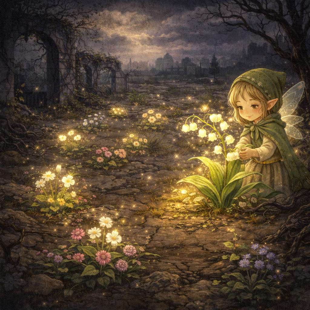 작은 하얀 꽃들이 고개를 숙이며 피어났어.
