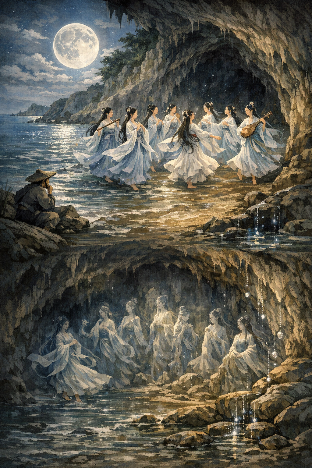 한 어부가 달빛에 비친 선녀들의 그림자를 보게 되었다.