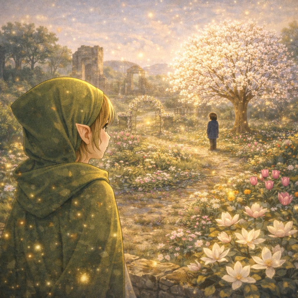 꽃잎 같은 초록빛을 두른 아이가 서 있었어.