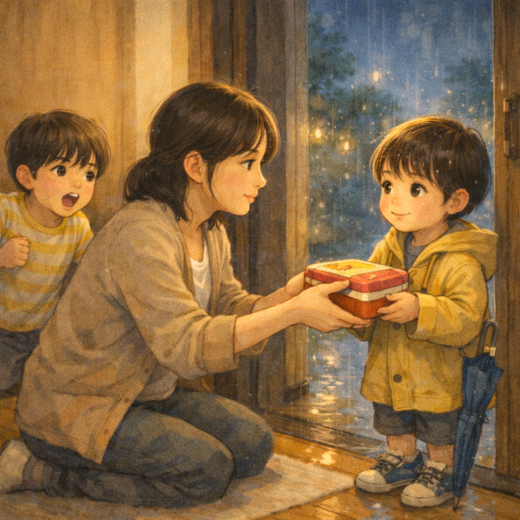 동생은 두 손으로 도시락을 꼭 잡았어.