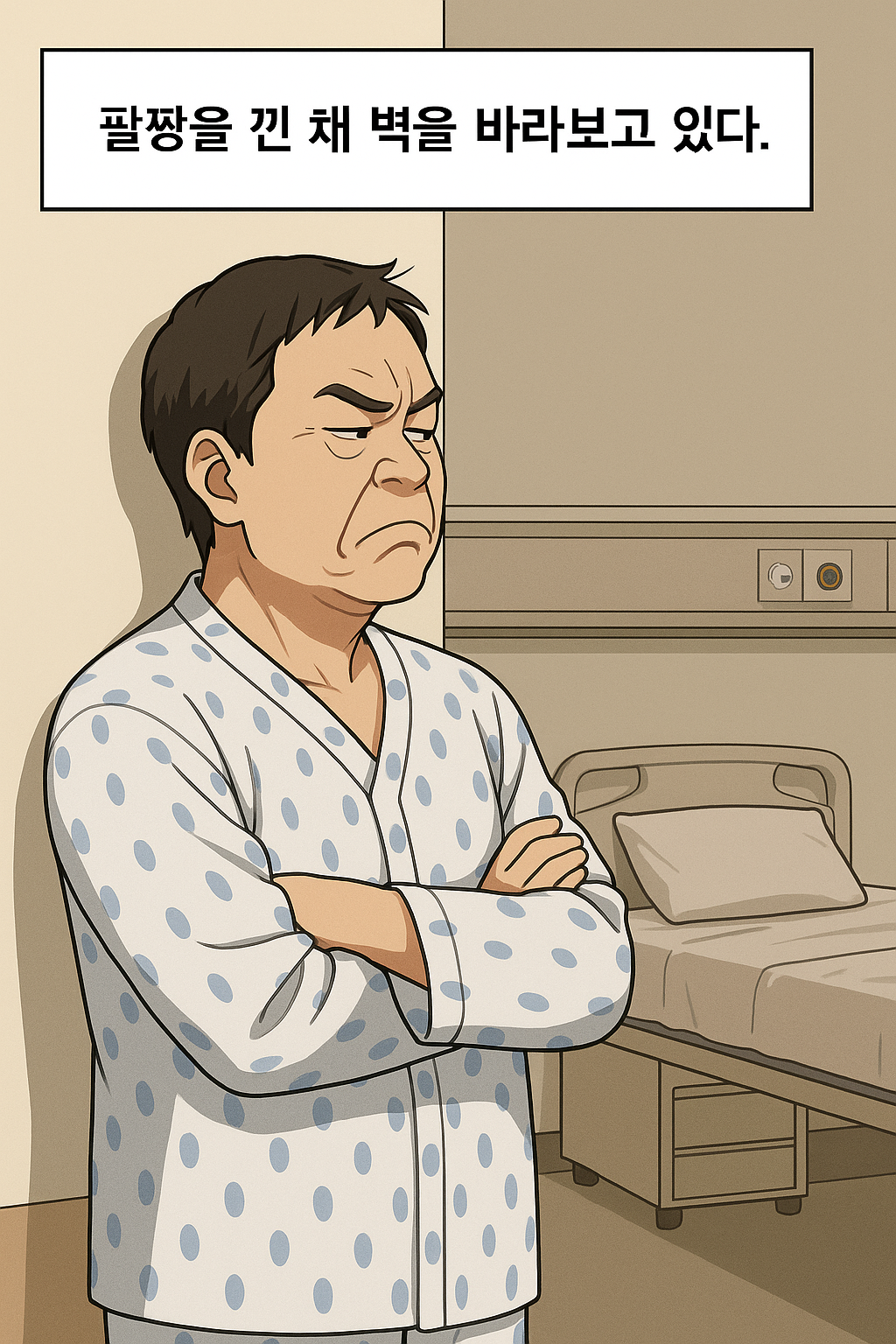 조마 씨는 팔짱을 낀 채 벽을 바라보고 있다.