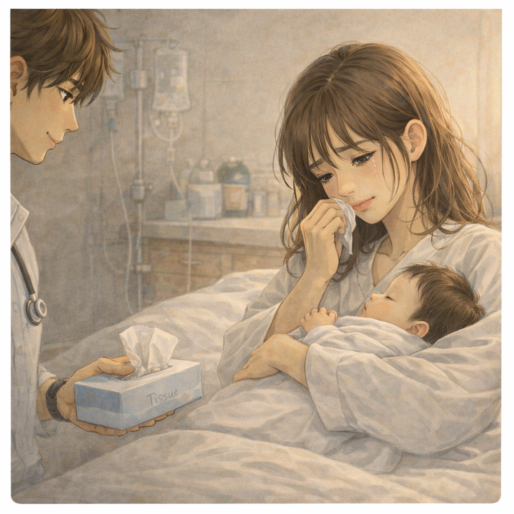 산모의 눈에서 눈물이 떨어졌다.