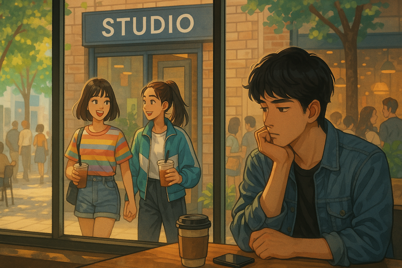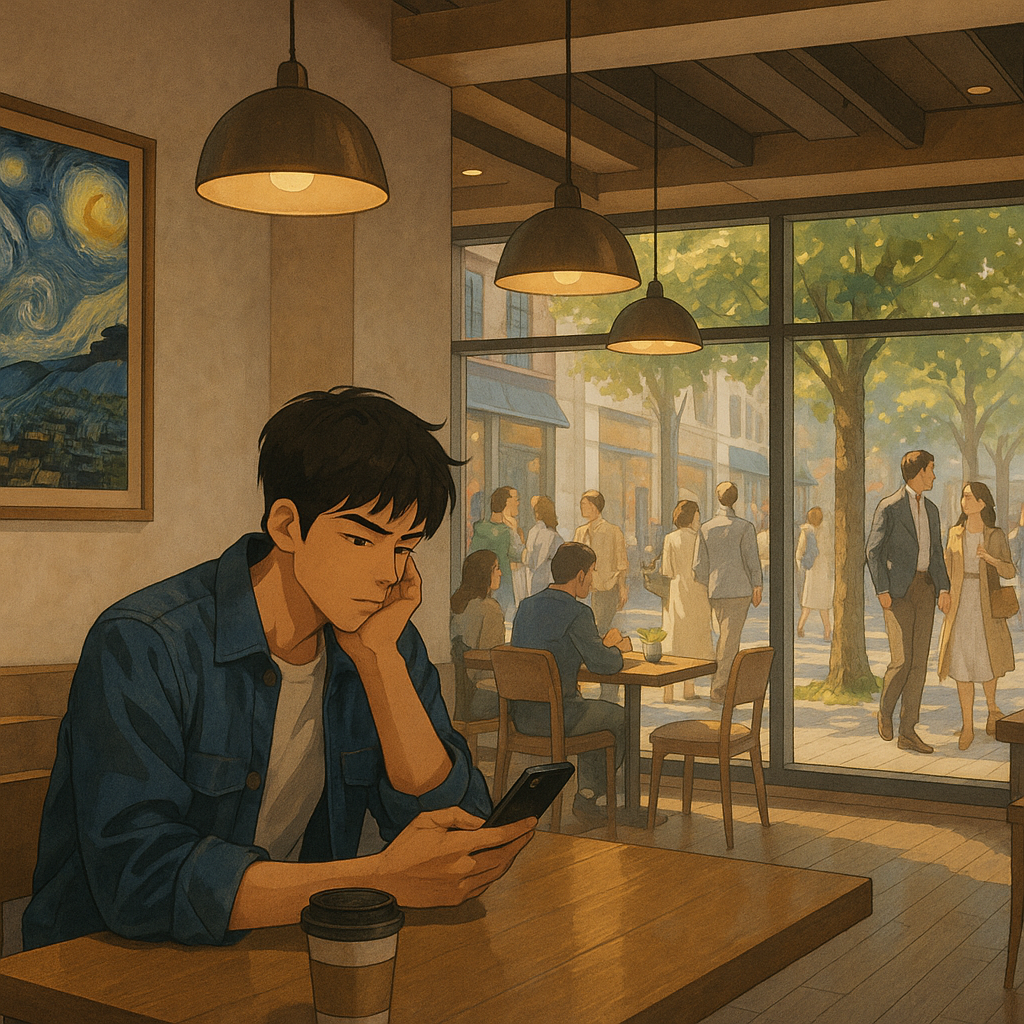 커피 머신이 내는 소리와 함께 바리스타가 바쁘게 커피를 만들고, 손님들은 저마다의 시간을 즐기고 있다. 진은 게임을 하다가 지루해진 듯 한숨을 내쉬었다. 창밖으로 보이는 가로수와 거리를 지나는 사람들을 잠시 바라보다가, 핸드폰을 내려놓고 주변을 둘러보았다. 카페의 유리창 너머로는 사람들이 끊임없이 오가며 활기찬 모습을 보였다. 압구정 가로수길의 활기와 세련됨 속에서, 진은 순간의 무료함을 느끼고 있었다.