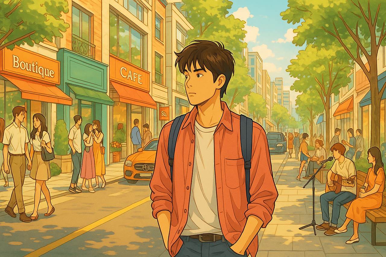한쪽에는 고급 외제차들이 줄지어 주차하고, 거리에는 유명한 패션 매장들이 손님들을 끌어모았다. 곳곳에 배치된 벤치에는 사람들이 앉아 커피를 마시며 여유를 즐기고 있다. 거리의 음악 소리는 사람들의 발걸음을 경쾌하게 만든다. 길거리 공연을 하는 뮤지션들이 기타를 치며 노래를 불렀고, 지나가는 사람들은 잠시 멈춰 서서 그들의 음악을 감상했다.