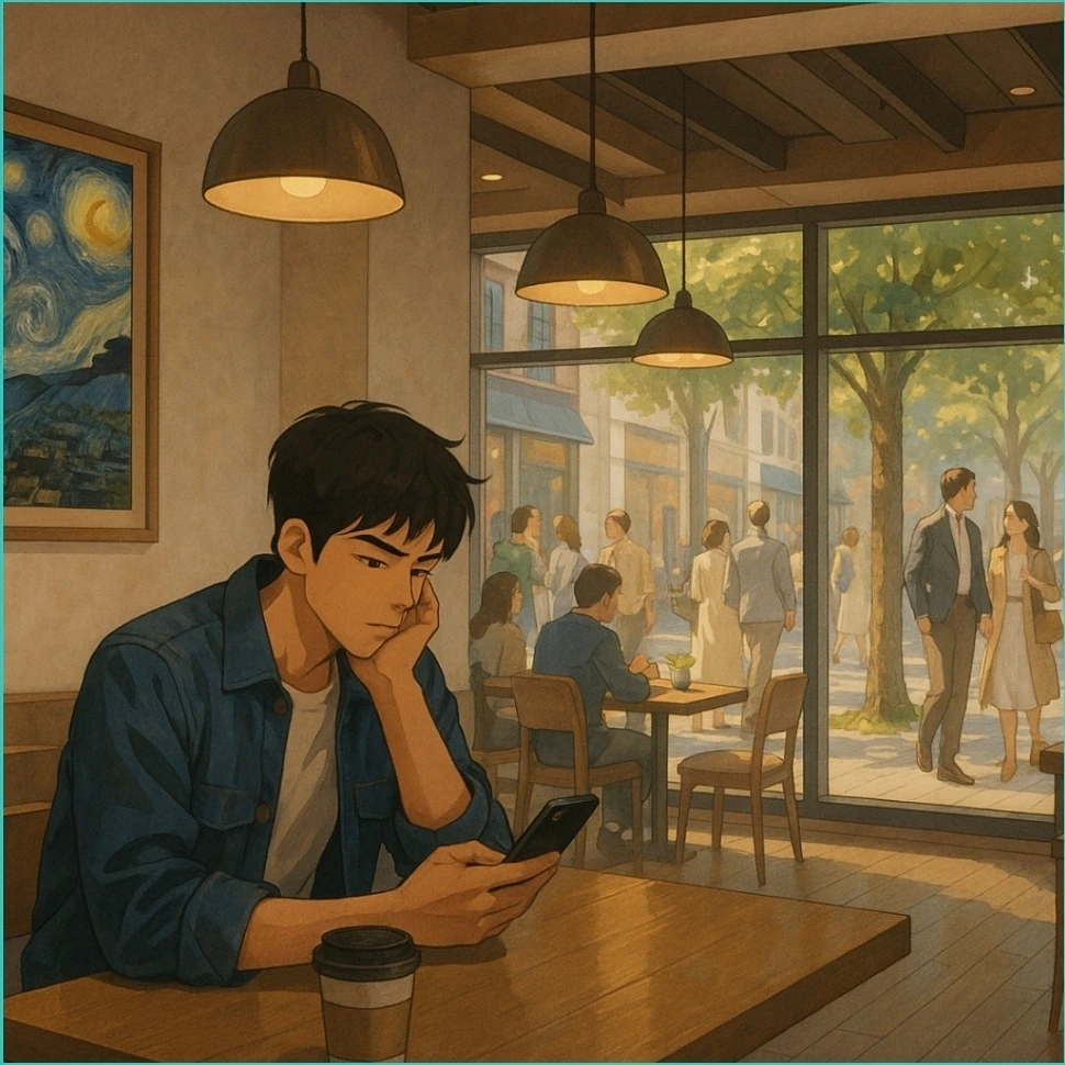 음악 소리가 요란한 한 카페 안에서, 진은 무료한 표정으로 핸드폰을 만지작거리고 있다. 카페 내부는 모던한 인테리어로 꾸몄고, 진한 커피 향 베인 벽에는 유명 화가의 그림들이 걸렸다. 조명이 은은하게 빛나며 따뜻한 분위기를 자아내고, 테이블마다 사람들이 앉아 이야기를 나누고 있다.