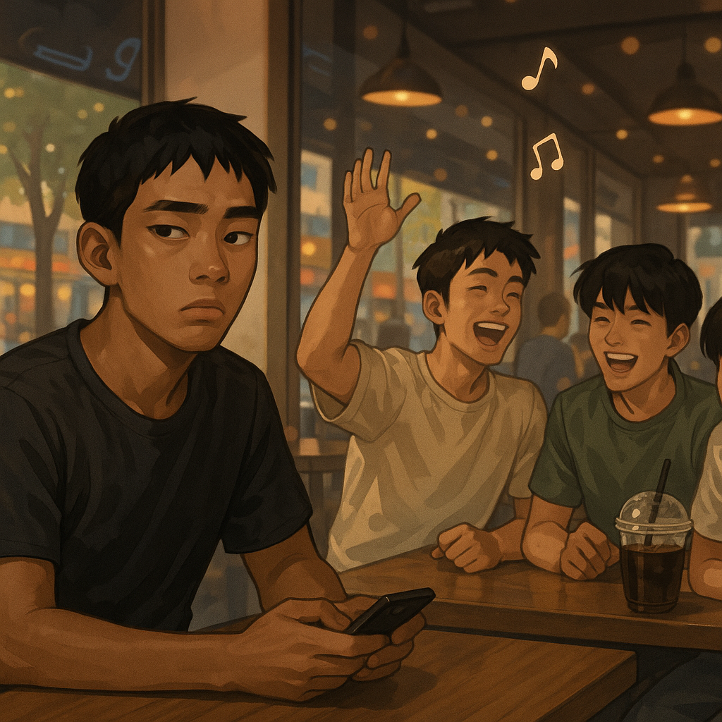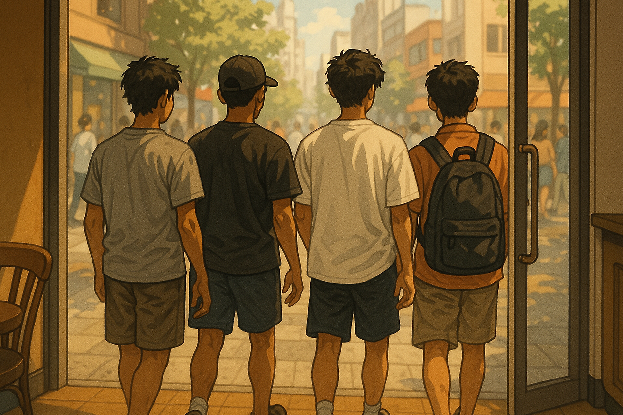 “뭐 재미난 일 없냐? 심심한데 농구나 하러 갈까?” 까무잡잡한 피부에 큰 눈이 신경질적으로 반짝이며, 진이 혼잣말처럼 말했다. 그때 가게 문이 열리고 친구들이 하나둘 들어섰다.
