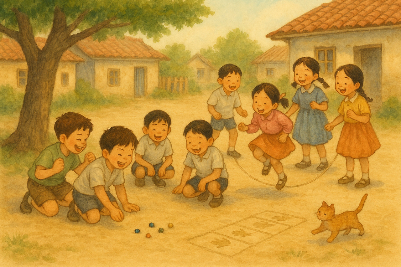 친구들과 구슬치기를 하며 신나게 외쳤어요.