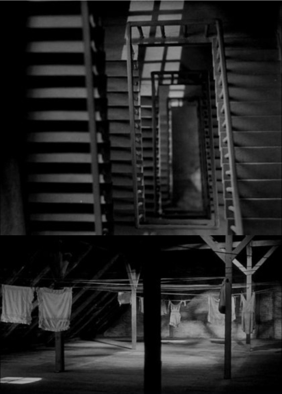 뒷골목 범죄 조직과 경찰 조직이 같은 목적(범인 색출)을 지닌다는 점을 시각적으로 보여주기 위해, 서로 다른 인물들이 동일한 동작을 이어받는 병치 쇼트를 구성했다.