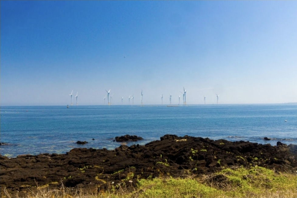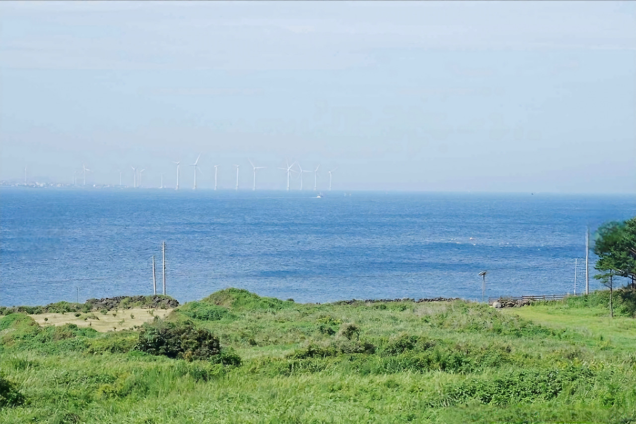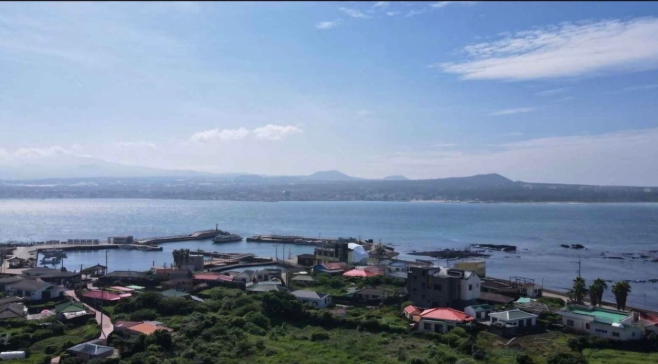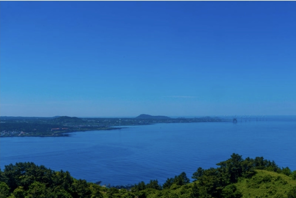 제주 본섬의 해안선이 푸르게 펼쳐져 있다.