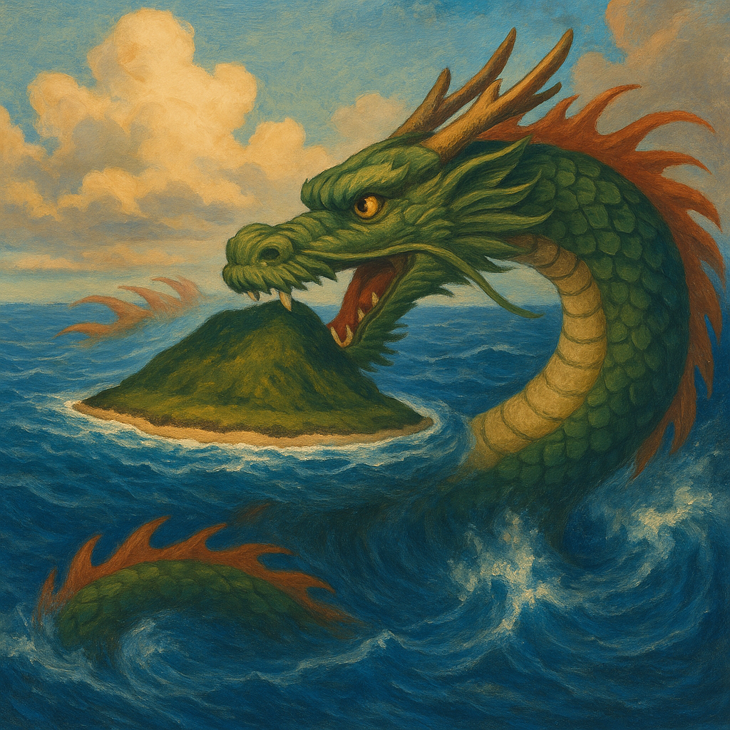 푸른 물결 속을 헤치며 용이 섬을 물고 달릴 때,
