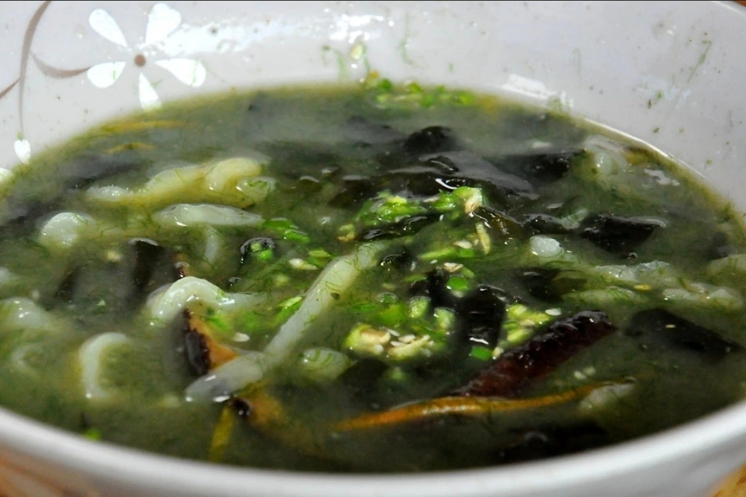 김, 파래, 톳 등을 섞어 된장국처럼 푹 끓인 따뜻한 국.