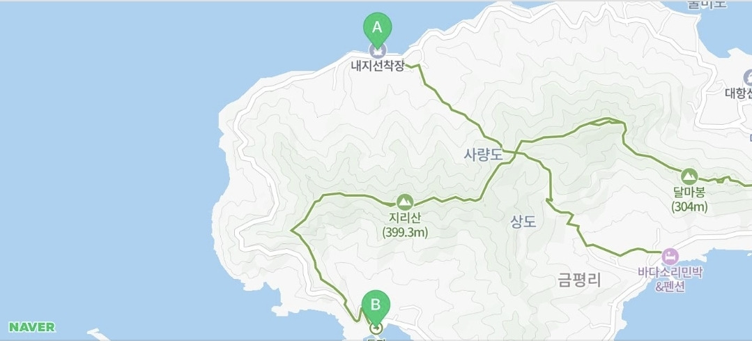종주 시작점 또는 종료지점. 등산 전후 섬 주민들과 눈 마주칠 수 있는 조용한 마을.
