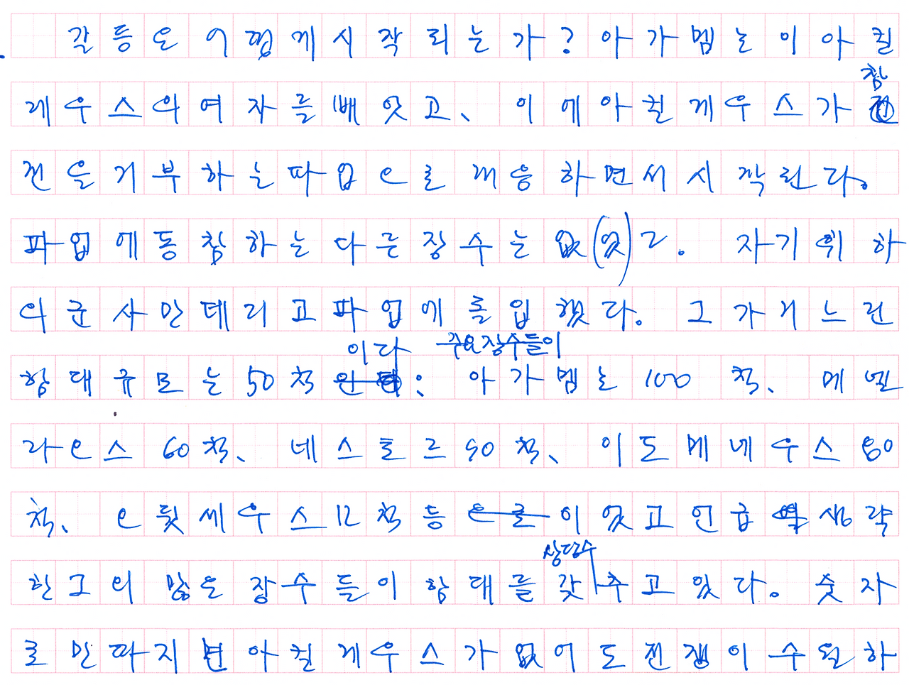 갈등은 어떻게 시작되었는가? 아가멤논이 아킬레우스의 여자를 빼앗고, 이에 아킬레우스가 참전을 거부하는 파업으로 대응하면서 시작되었다. 파업에 동참하는 다른 장수는 없다. 자기 휘하의 군사만 데리고 파업에 돌입했다. 그가 거느린 함대의 규모는 50척이다. 주요 장수들이 아가멤논 100척, 메넬라오스 60척, 네스토르 90척, 이도메네우스 80척, 오뒷세우스 12척이다. 그외 많은 장수들도 상당수의 함대를 갖추고 있다. 숫자로만 따지면 아킬레우스가 없어도 전쟁이 수월하게 수행될 수 있을 듯싶다. 그러나 파업은 대성공을 거두었다.