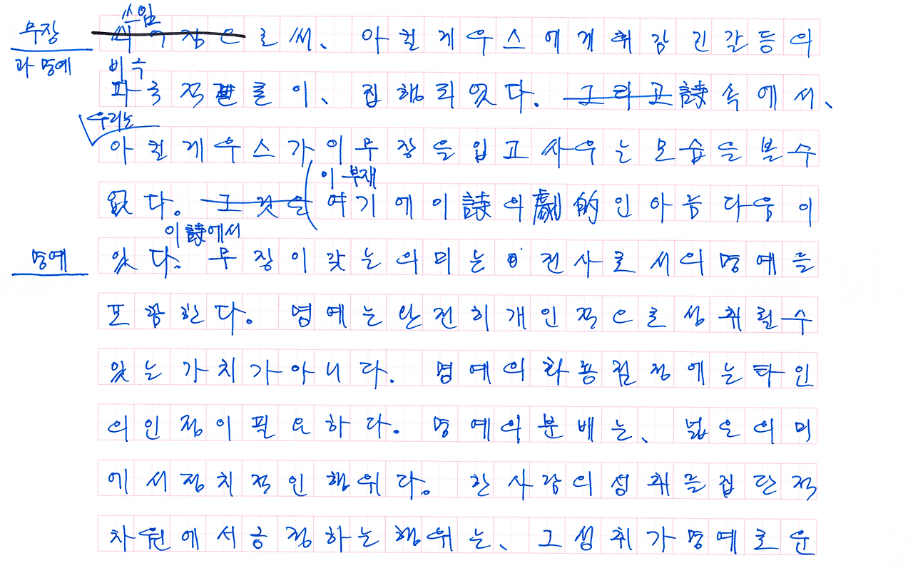 홀로 뛰어난 사냥꾼은 될 수 있을지도 모른다. 그런데 홀로 뛰어난 전쟁군인은 될 수 없을 테다. 그것이 아킬레우스에게 매겨진 괴로움의 원인이라고, 나는 깨닫는다. 그것이 아킬레우스가 독존과 공존 사이에서 갈등하게 만드는 원인이다. 이어지는 아킬레우스의 독백이 인상적이다.