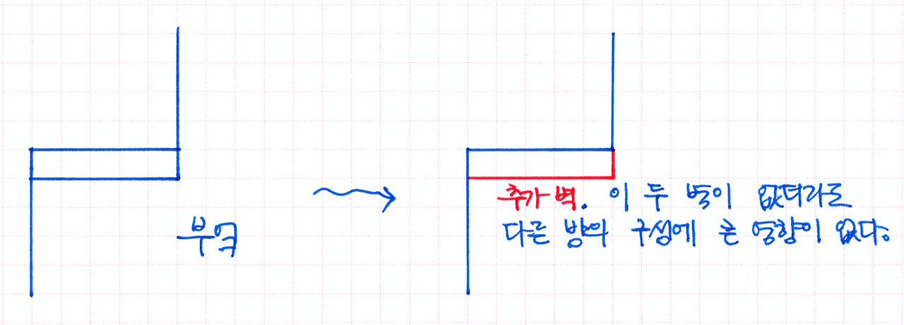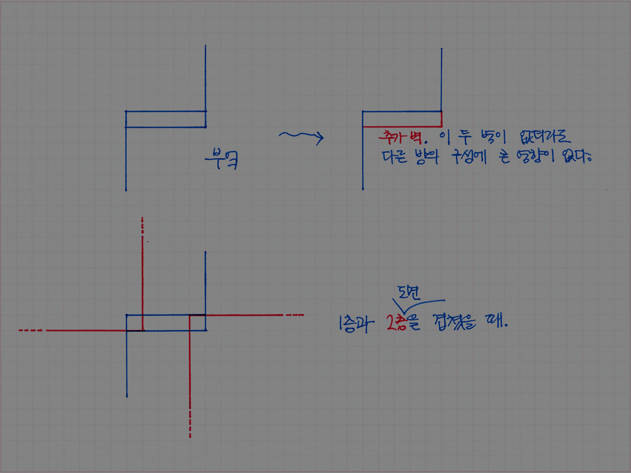 도면은 두 장이다. 1층 도면과 2층 도면이다. 미심쩍은 부분이 여럿 발견되지만, 그중에서도 가장 기묘한 문제점은 각 층 도면에서 한 가지씩 꼽힌다. 1층에는 주방 구석에 마련된 자투리 방에 이상한 점이 있었다. 부동산 업자조차도 용도를 모르는 공간으로, 아주 작은 공간인데다가 문이 없어 출입이 불가능하다. 이 목적불명의 협소한 공간은 다른 주요 공간을 구획하는 큰 벽에 추가로 벽을 덧대 만든 것이다. 추가된 벽은 오로지 이 공간을 만들기 위해 세워졌다고밖에는 생각되지 않는다. 추가 벽이 없더라도 다른 방의 구성에 영향을 미치지 않는데다가, 부엌을 더 넓게 쓸 수 있음에도 구태여 벽을 추가로 세워 공간을 할애한 것이기 때문이다. 문이 없어서 직접 확인하기도 여의치 않은데다가 설계 단계서부터 계획된 것으로 보이니, 어딘가 께름칙한 느낌을 지울 수 없다.
