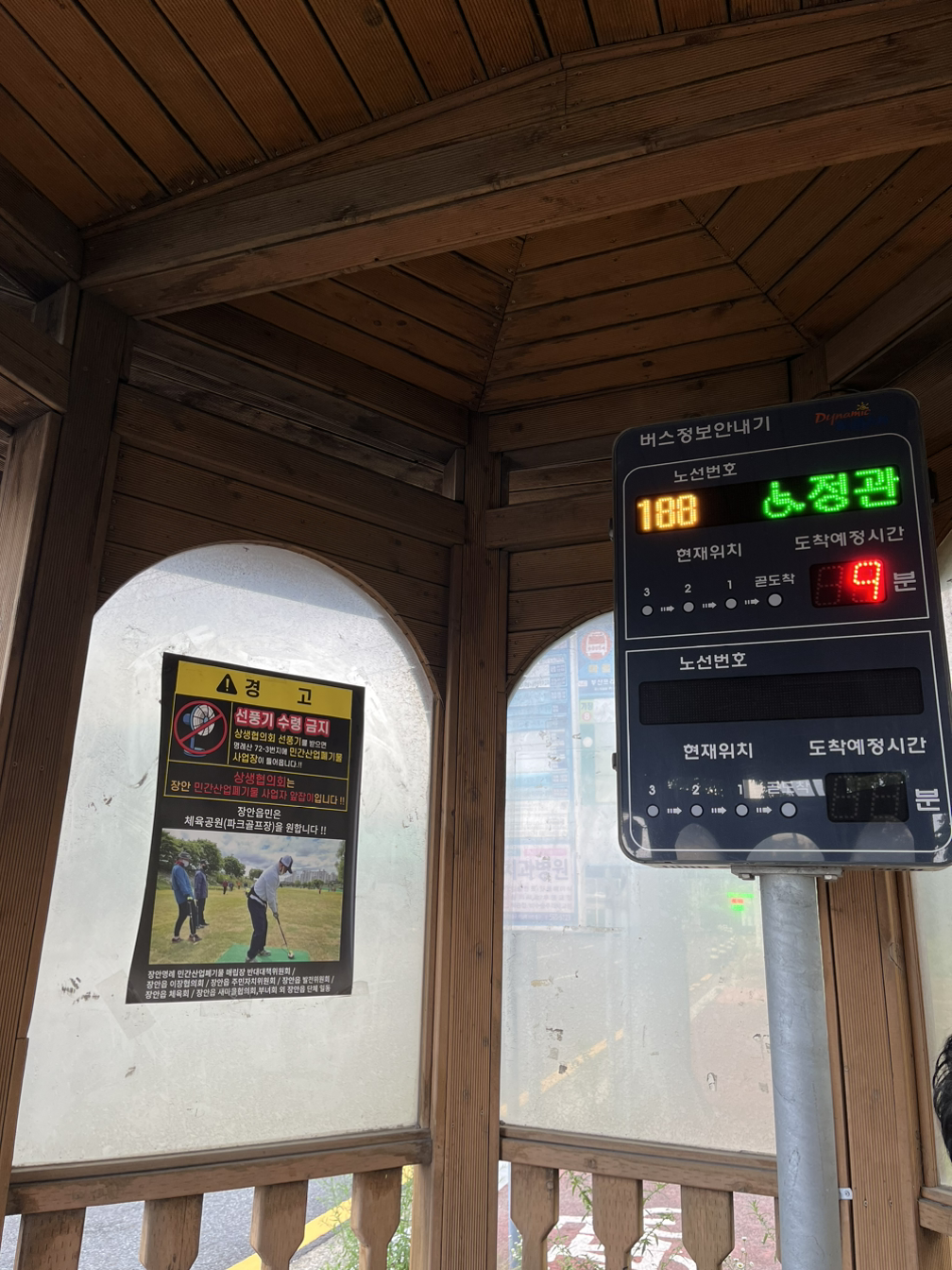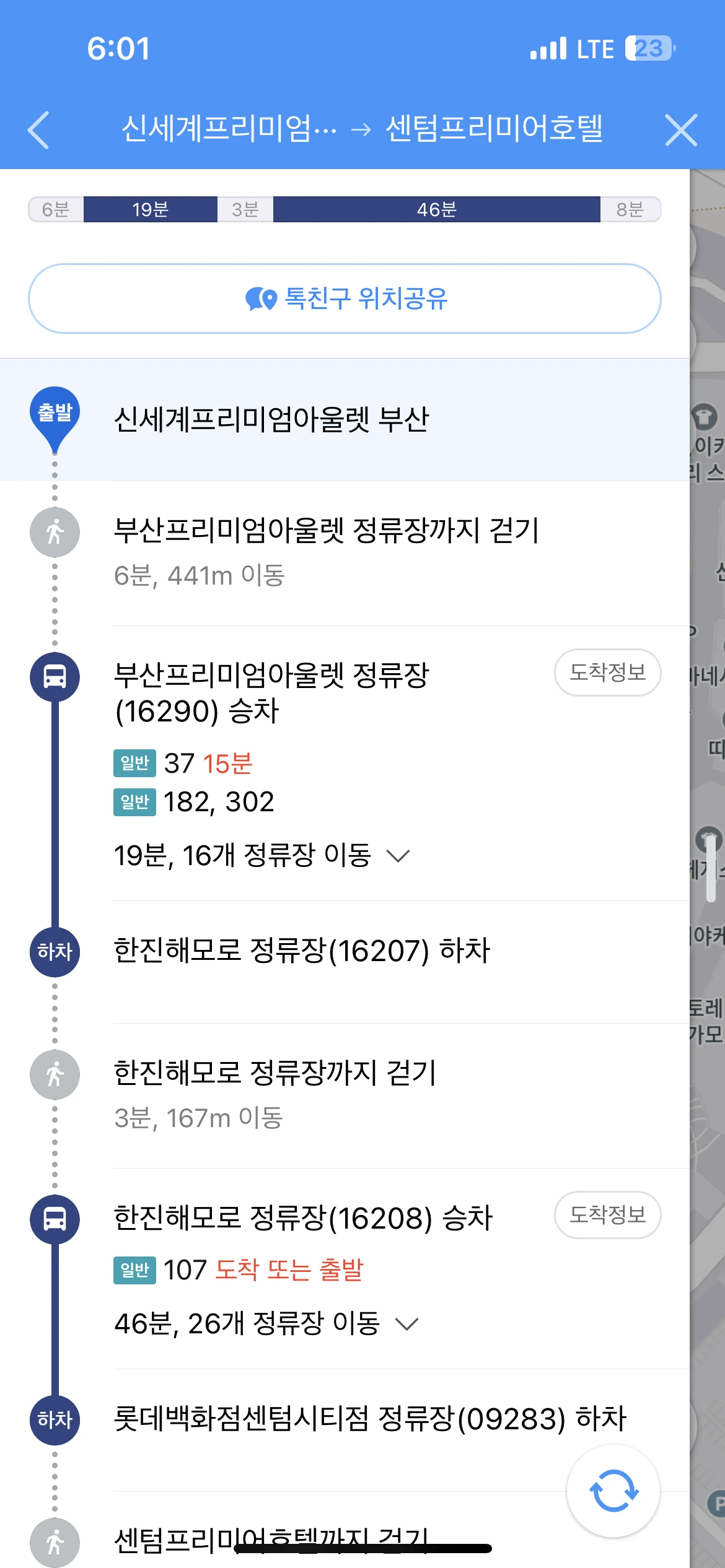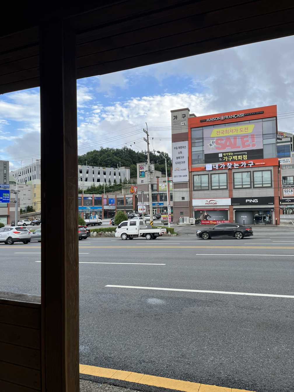 부산프리미엄아울렛 정류장에서 37번을 기다리고 있었고, 한진해모로 정류장에서 하차한 뒤 롯데백화점센텀시티점 정류장으로 가야 했다. 이때는 비가 적게 오고 있었다.