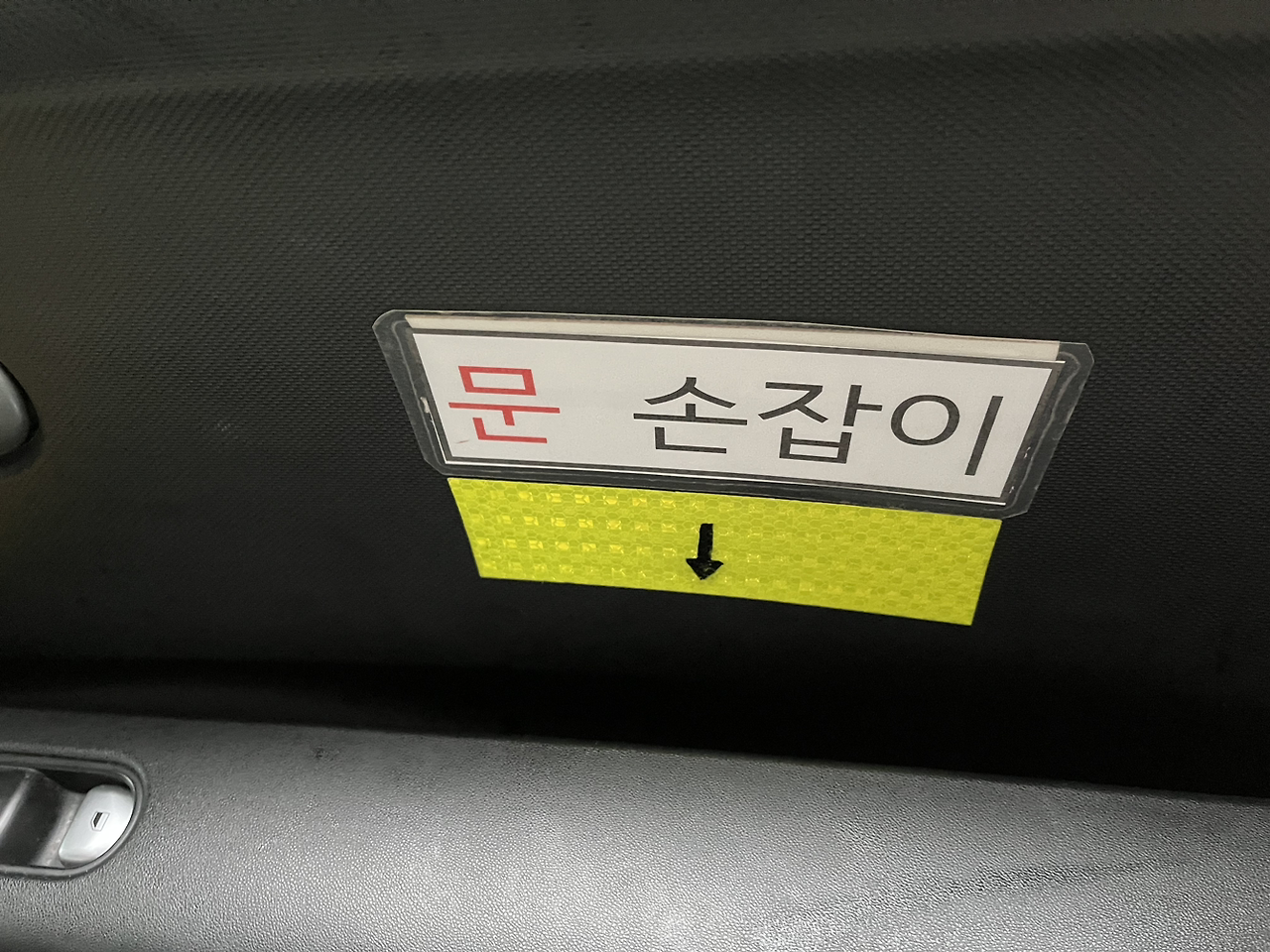 집에서 나오는 길에 카카오 택시를 불렀다. 가끔 택시이용 때문에 전기자동차를 타다 보면 손잡이가 안 보여서 손을 휘적휘적하곤 했는데, 여기 기사분은 친절하게 스티커로 안내표시를 해놓으셨다.