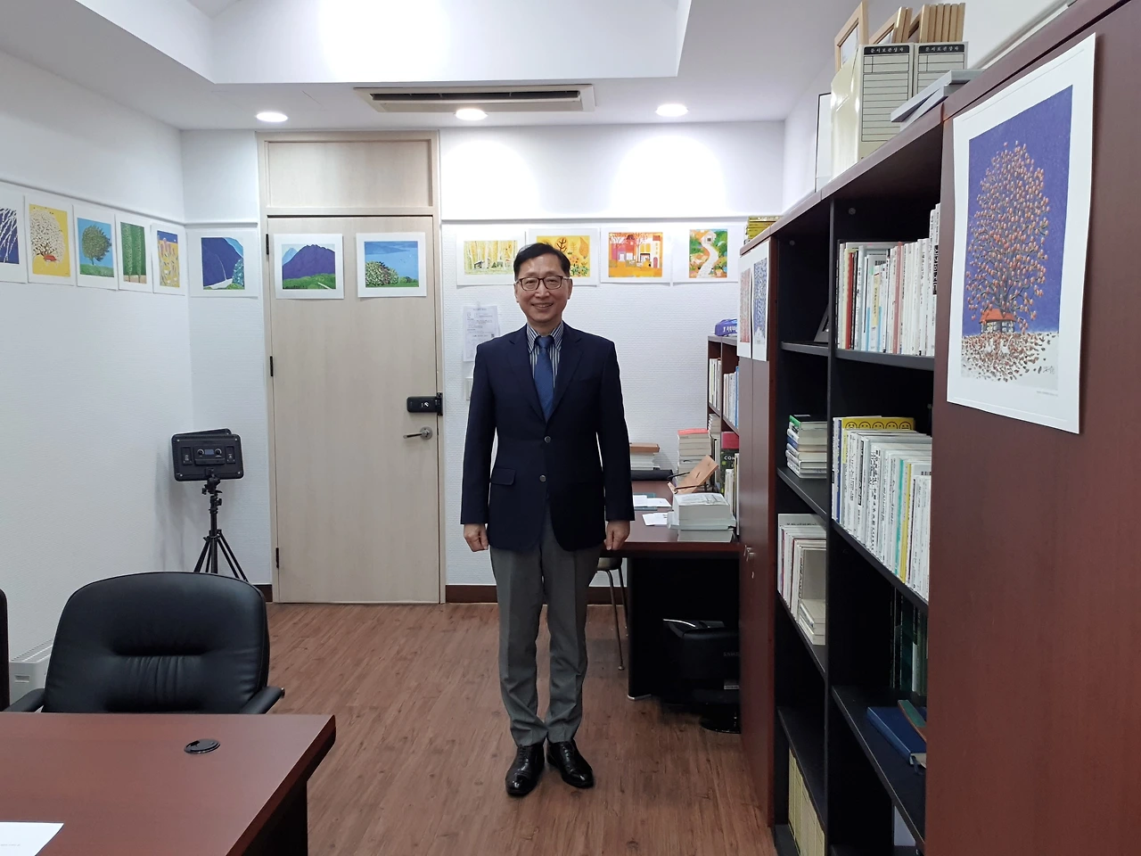 책상 위에는 검정, 파랑, 빨강 볼펜 세 자루