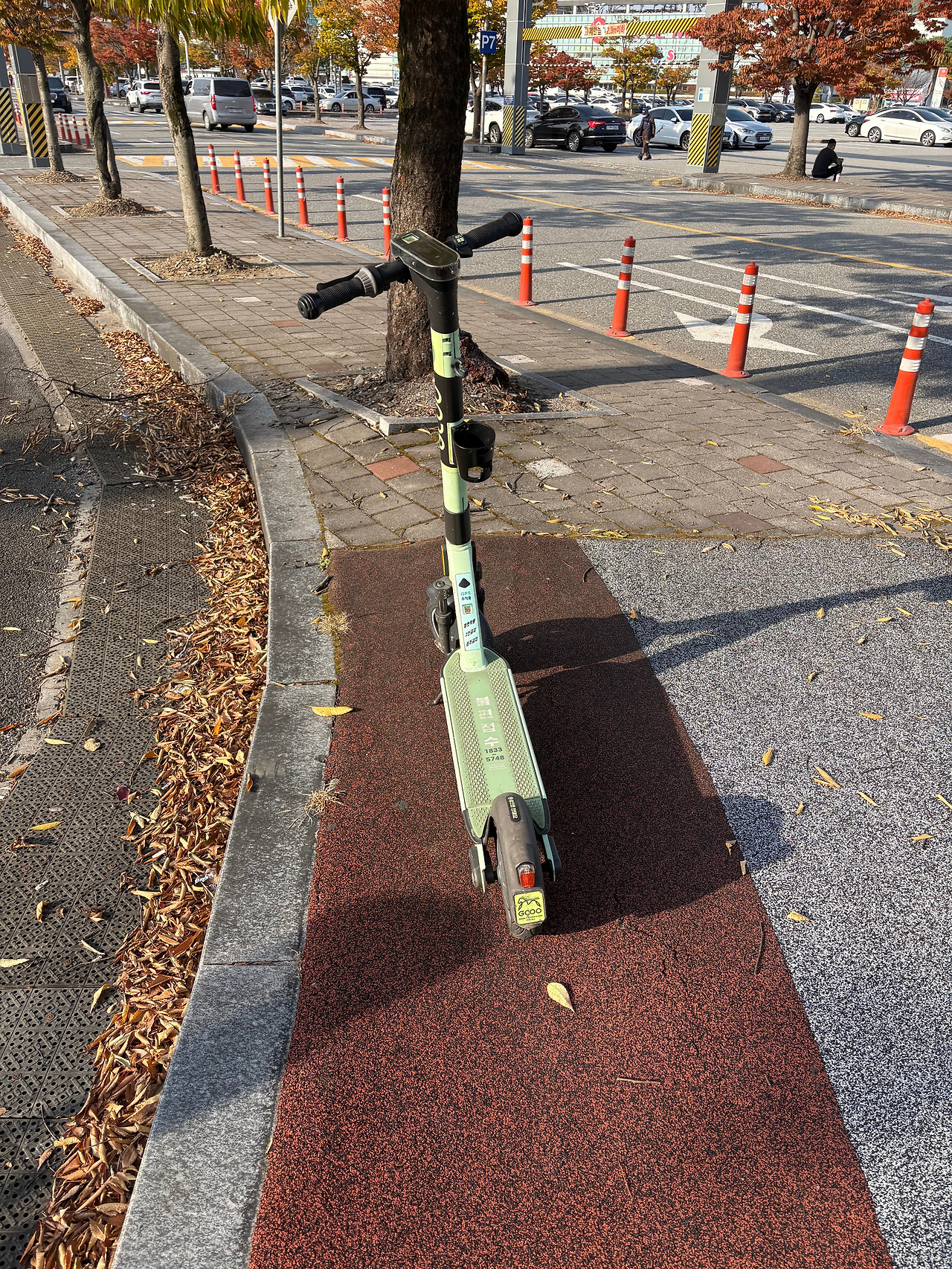 가게 앞에 아무렇게나 세워둔 킥보드,