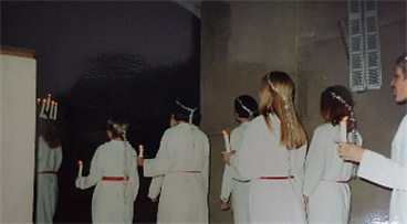 또 다른 초대는, 매년 12월이면 본국에서 오는 ‘산타 루씨아 사절단’ 맞이 행사였다. ‘산타루씨아 사절단’은 스웨덴의 여러 고등학교에서 선발된 여학생들로서 자국 대사관의 문화행사의 일환으로 오는 건데, 대사, 공사, 무관 등 대사관 주요 직위자들이 자기 숙소에서 친분이 있는 사람들을 초청하여 이들에게 소개하는 행사란다. 행사는, 인솔 여학생이 머리에 여러 개의 촛불을 두른 관을 쓰고 선두에서 걸으면 동료 여고생 수십 명이 노래를 함께 부르며 그 뒤를 따른다. 로마 시대의 기독교인 박해를 피해 지하에 숨어 살던 기독교인에게 양손으로 음식을 나누어 주기 위해 음식을 나르는 소녀가 머리에 촛불을 두르고 서빙을 한 데서 연유하는데, 야만에서 뒤늦게 기독교로 개종한 북유럽에서는 꽤 유명한 행사란다. 스웨덴 무관은 자기네 전통에 따라 새벽 일찍(05:00시쯤) 손님을 숙소에 초청하여 이들과 ‘산타루씨아’ 노래를 함께 부르고 촛불 축제를 하였다.
