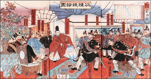 칙명에 따라 개최된 회의에서, ‘사이고 다카모리’는 ‘자신을 조선에 사절로 보내면 조선은 필경 자신을 죽일 것이니, 자신을 희생물로 삼아 조선과 전쟁을 해라’라고 주장하였다. 이는, 가뜩이나 불만에 찬 사무라이들의 불만 배출을 위한 ‘전쟁의 명분’으로 자신의 '목숨을 미끼로'로 내놓은 것인데, 이게 이른바, ‘사이고 다카모리’의 ‘정한론’이었다. 그러나, 1872년 당시 일본의 국력으로는 조선을 쉽사리 굴복시킬 정도는 아니었다.