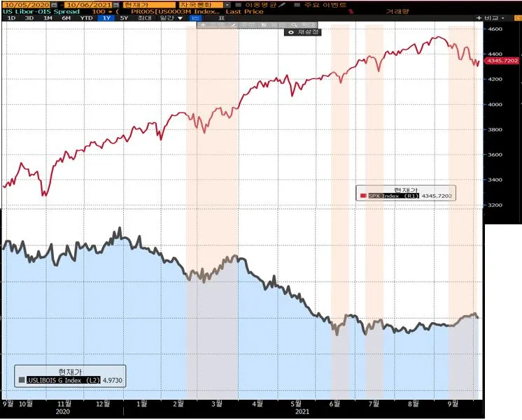 * 아래 진한 회색선이 LIBOR OIS 지표이며, 마지막 grid가 최근 9월인데, 9월 상승속도가 매우 빨랐고 이전 3개월 고점을 넘어섰다.