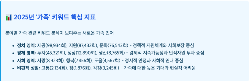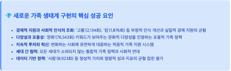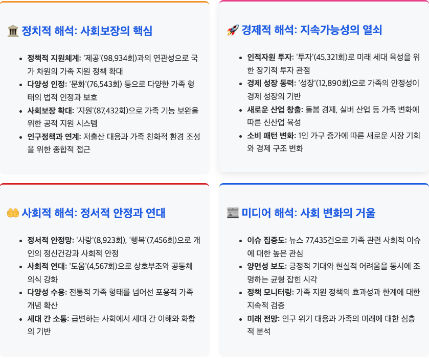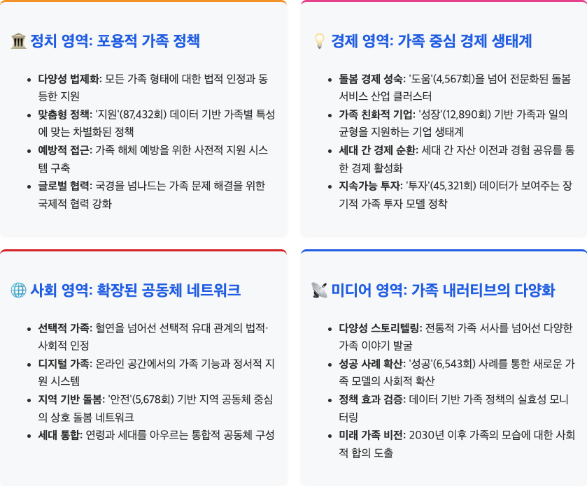 '다양성 포용적 가족관(Inclusive Family Paradigm)' 패러다임의 등장: 정치(제공 98,934회), 경제(투자 45,321회), 사회(사랑 8,923회, 행복 7,456회) 영역을 아우르는 종합적 가족 지원이 새로운 사회 정책의 핵심으로 부상했습니다.