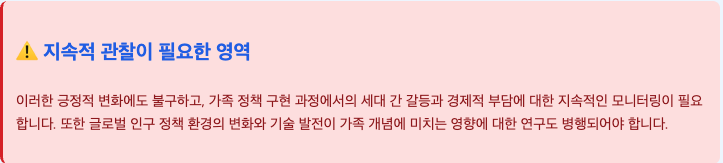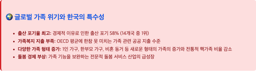 '가족 회복탄력성(Family Resilience)' 개념의 확산: 경제적 지속가능성을 결정하는 핵심 변수로서 가족의 역할이 재정의되었으며, 단순한 복지 대상이 아닌 국가 경쟁력의 원천으로 인식되었습니다.