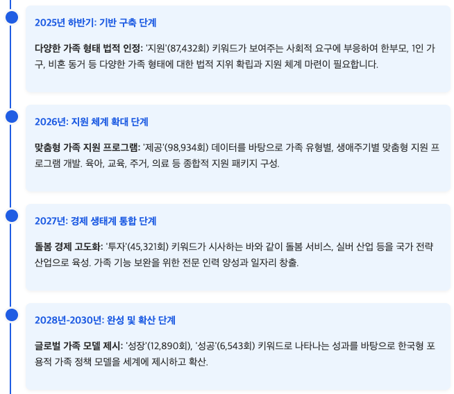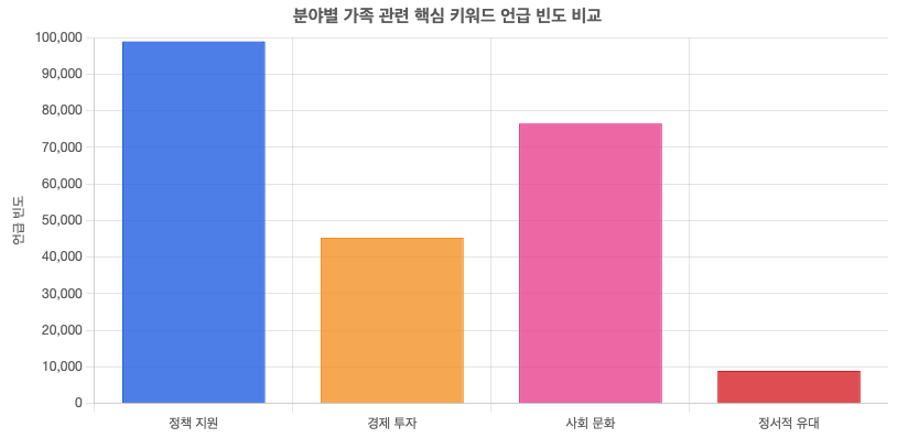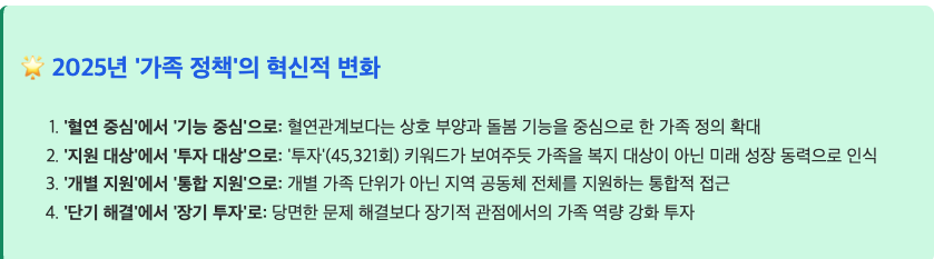정책적 우선순위로서의 확고한 지위: '제공'(98,934회)의 압도적 높은 빈도는 가족 지원이 더 이상 선택적 복지가 아닌 필수적 국가 정책으로 자리잡았음을 보여줍니다.