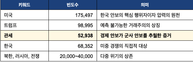 이 데이터가 보여주는 가장 중요한 통찰은 '관세'라는 경제 키워드가 '북한'이나 '전쟁' 같은 전통적 안보 키워드보다 훨씬 높은 빈도로 등장한다는 점입니다. 이는 2025년 한국인들에게 '안보'란 더 이상 군사적 위협만을 의미하지 않는다는 것을 보여줍니다.