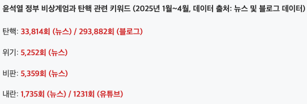 2025년 '갈등, 사회' 담론의 가장 큰 맥락은 바로 윤석열 정부의 비상계엄 선포와 탄핵이었습니다. 블로그와 뉴스 데이터에서 탄핵, 위기, 비판과 같은 키워드가 꾸준히 상위권에 있었던 것은 이 사건의 영향이 얼마나 컸는지 보여주는 것입니다.