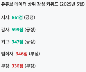 유튜브는 매우 극단적인 감성을 표출하였습니다. 지지, 감사, 최고와 같은 극찬 키워드가 많은 동시에, 범죄자, 부정, 잘못과 같이 강한 비난 키워드 또한 상위권에 위치했습니다. 이는 유튜브가 정치적 스탠스가 명확한 채널들이 많고, 특정 진영의 콘텐츠가 강하게 소비되는 경향이 있어서 나타나는 현상으로 분석됩니다. 한쪽에서는 열렬한 지지를, 다른 쪽에서는 맹렬한 비판을 쏟아내는 양극화된 감성 소비가 두드러졌습니다.