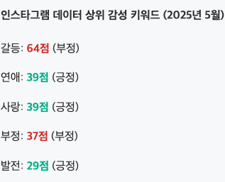 그러나 동일한 시기에 블로그와 인스타그램에서는 다른 양상이 관찰되었습니다. 블로그에서는 발전(17,168점), 새로운(14,380점), 안정(13,358점)과 같은 해결 지향적인 키워드들이 높은 빈도를 보였습니다. 인스타그램 또한 사랑, 연애와 같은 일상 키워드와 함께 발전을 언급하며 사회 갈등을 개인의 삶과 연결 짓는 '맥락적 감성 재구성'을 나타냈습니다. 이는 각 플랫폼이 단순히 감정을 소비하는 것을 넘어, 갈등을 해석하고 나아가려는 방식이 상이하다는 것을 의미합니다.