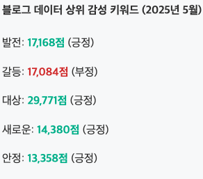 블로그에서는 뉴스에서와는 다르게 발전, 새로운, 안정과 같은 긍정적인 키워드가 두드러지게 나타났습니다. 물론 갈등, 위기와 같은 부정적 키워드도 여전히 높았으나, 블로그는 개인의 생각을 깊이 담는 공간인 만큼, 갈등을 분석하고 해결책을 모색하려는 움직임이 강하게 나타났습니다. '어떻게 하면 이러한 갈등을 해결하고 더 나은 사회로 발전할 수 있을까?' 하는 고민들이 엿보이는 부분입니다.
