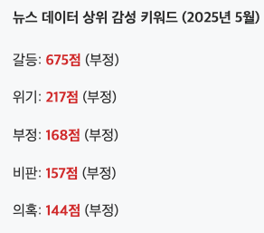 지금까지 '갈등, 사회'라는 키워드를 중심으로 2025년 상반기 한국 사회를 데이터로 분석하였습니다. 몇 가지 중요한 결론을 정리하면 다음과 같습니다: