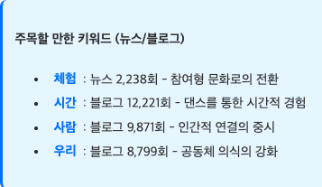뉴스는 댄스를 문화산업의 관점에서 접근하며 '공연', '축제', '체험' 등의 키워드가 높은 빈도를 보입니다. 특히 '체험'이라는 키워드는 댄스가 관람형에서 참여형 문화로 전환되고 있음을 시사합니다. 블로그는 '시간', '사람', '우리' 등 개인적 경험과 공동체적 가치를 강조하며, 댄스를 통한 개인적 성장과 사회적 연결에 집중합니다.