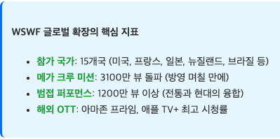 '월드 오브 스트릿 우먼 파이터'는 단순한 국내 프로그램을 넘어 글로벌 댄스 표준을 제시하는 플랫폼으로 진화했습니다. 15개국이 참여하는 국가 대항전 형식으로 확장되면서, K-댄스가 이제 세계 댄스 문화의 중심축 역할을 하고 있습니다. 특히 메가 크루 미션의 3100만 뷰 돌파는 K-댄스의 글로벌 영향력을 증명합니다.