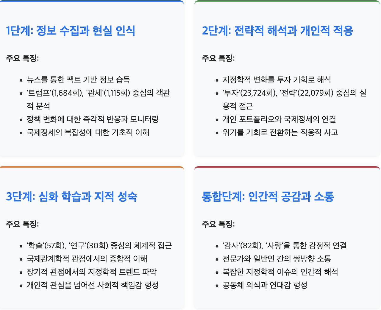 감정과 이성의 조화: 냉철한 분석과 인간적 공감이 분리되지 않고 서로 보완하는 구조를 형성하여, 보다 균형잡힌 지정학적 인식이 가능해졌습니다.