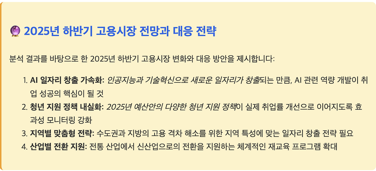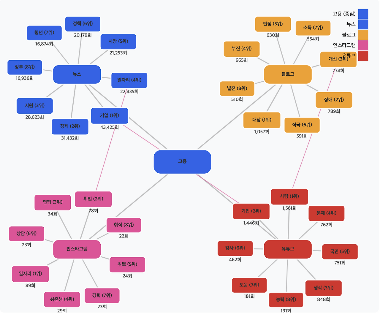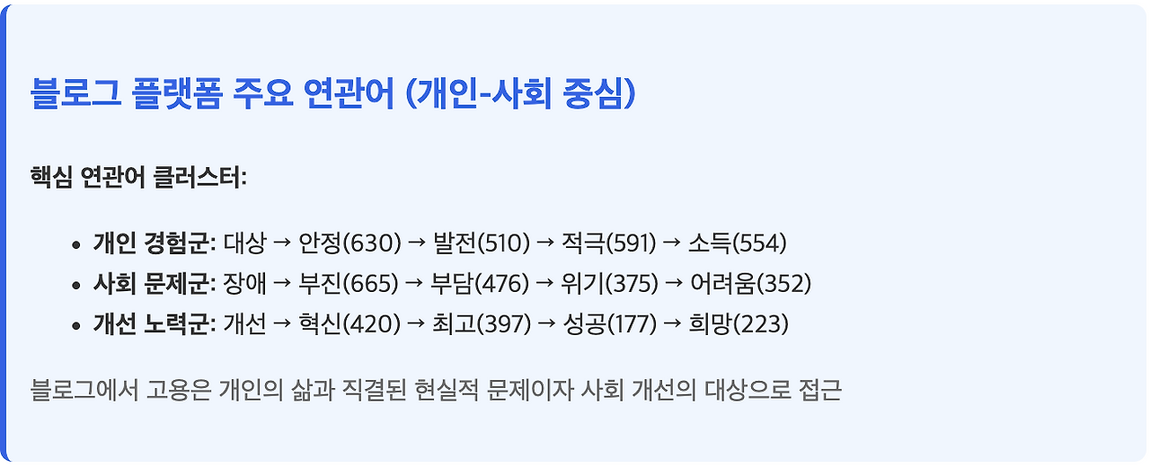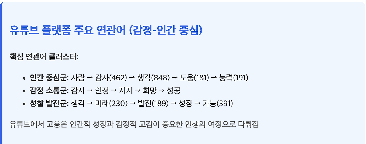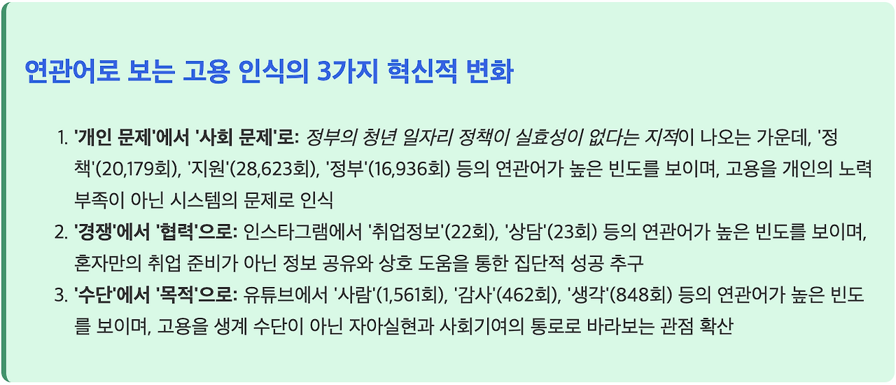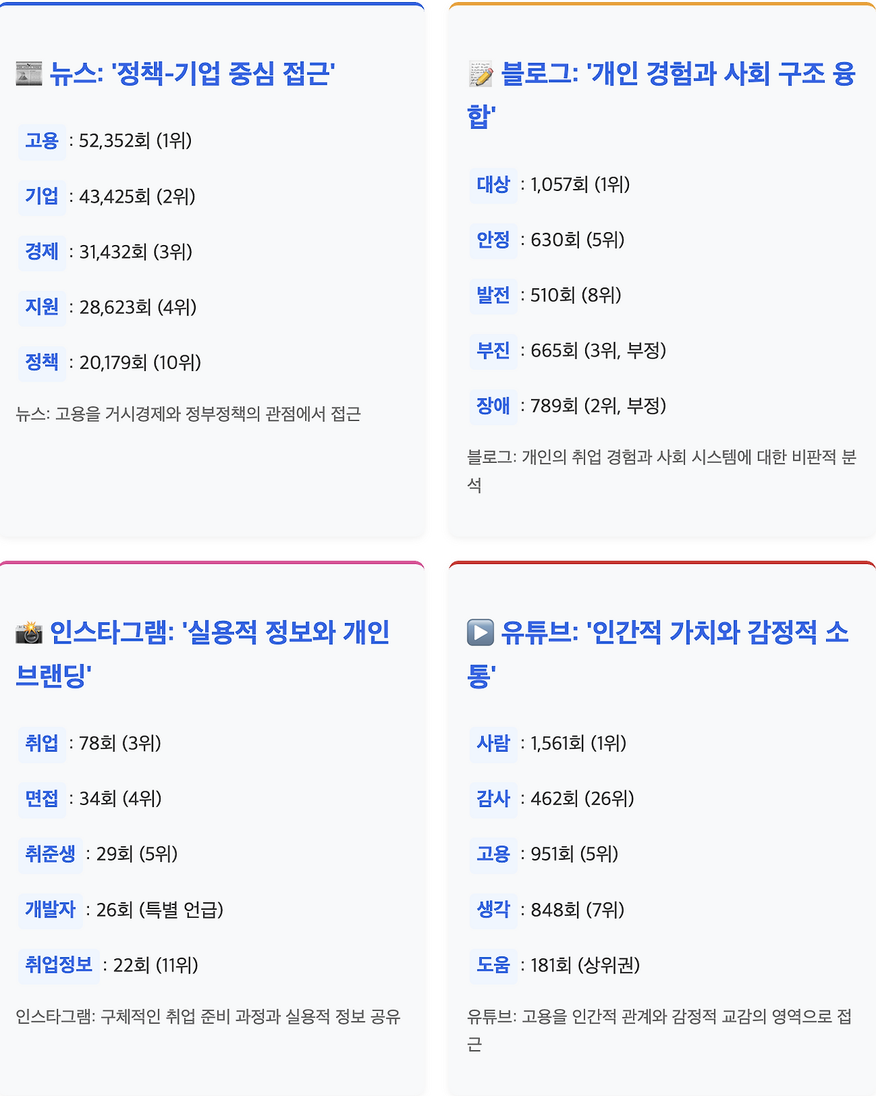 경제적 가치와 인간적 가치의 조화: 뉴스와 블로그의 경제중심 키워드가 유튜브의 '사람', '감사', '생각' 키워드와 간접적으로 연결되어, 고용을 경제적 수단과 인간적 가치의 균형 관점에서 바라보는 성숙한 담론 구조가 형성되고 있습니다.