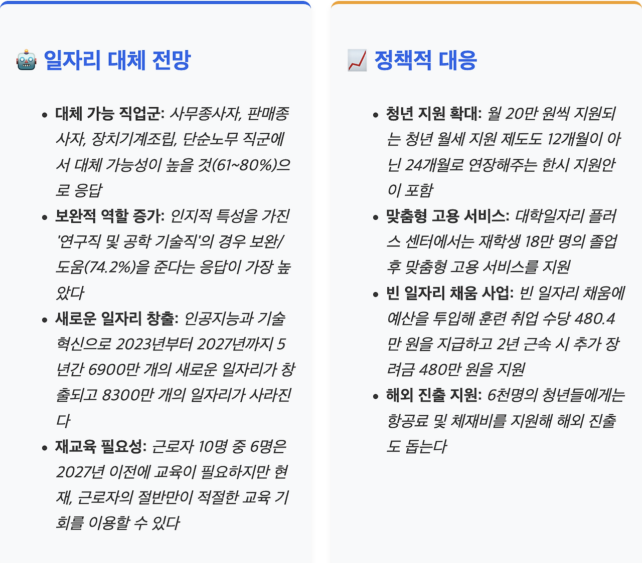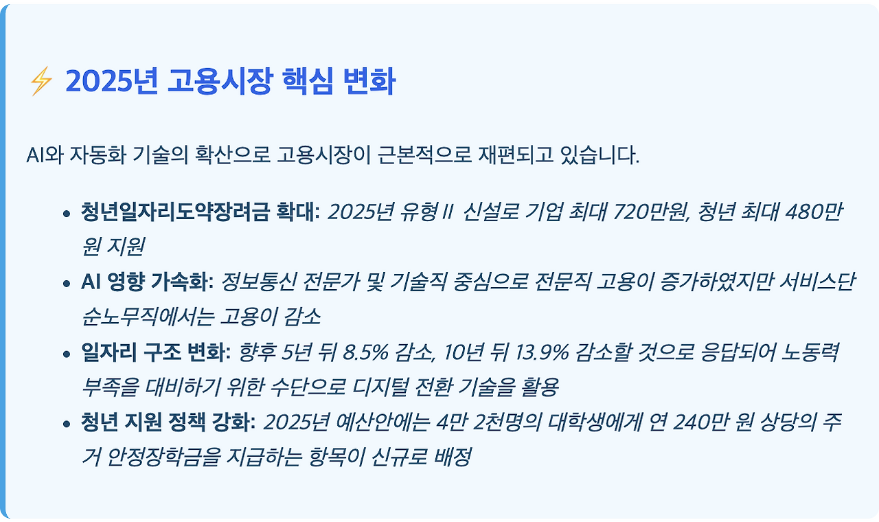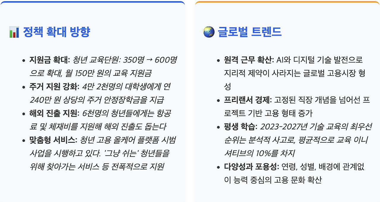 2023년부터 2027년까지 5년간 6900만 개의 새로운 일자리가 창출되고 8300만 개의 일자리가 사라진다는 급격한 변화 속에서도, 우리는 기술적 혁신과 인간적 가치가 조화를 이루는 고용 생태계로의 전환점에 서 있습니다. 특히 2025년 예산안에 포함된 다양한 청년 지원 정책이 실질적 효과를 거두면서, 정책과 현실, 기대와 실행이 균형을 이루는 성숙한 고용 정책 환경이 조성되고 있습니다.