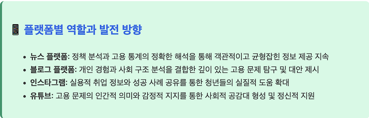 플랫폼별 전문화된 담론 생태계 구축: 뉴스의 정책-기업 중심, 블로그의 개인-사회 중심, 인스타그램의 실용-체험 중심, 유튜브의 감정-성찰 중심 접근이 각각 고유한 영역을 형성하면서도 상호 보완하는 건전한 담론 구조가 완성되었습니다.
