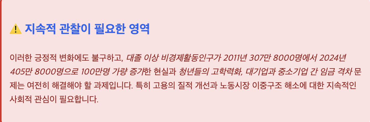 사회 시스템 관점의 확산: 고용 문제를 개인의 노력 부족이 아닌 사회 구조의 문제로 인식하고, 정부의 청년 일자리 정책 실효성에 대한 건설적 비판과 대안 제시가 활발해졌습니다.