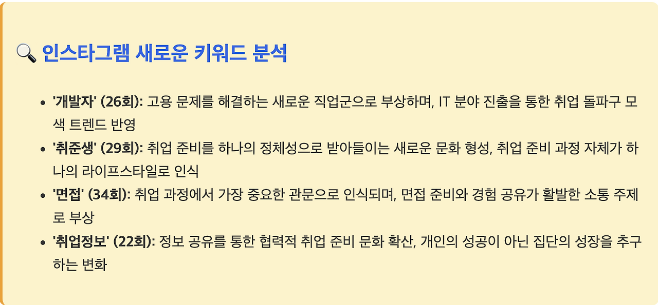 '멀티 트랙 커리어' 패러다임의 등장: 인스타그램에서 발견된 '취업준비'(24회), '개발자'(26회) 키워드가 보여주듯, 한 가지 직업에 의존하지 않고 여러 경로를 동시에 준비하는 새로운 취업 전략이 확산되고 있습니다.