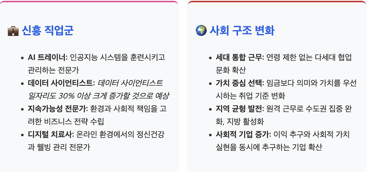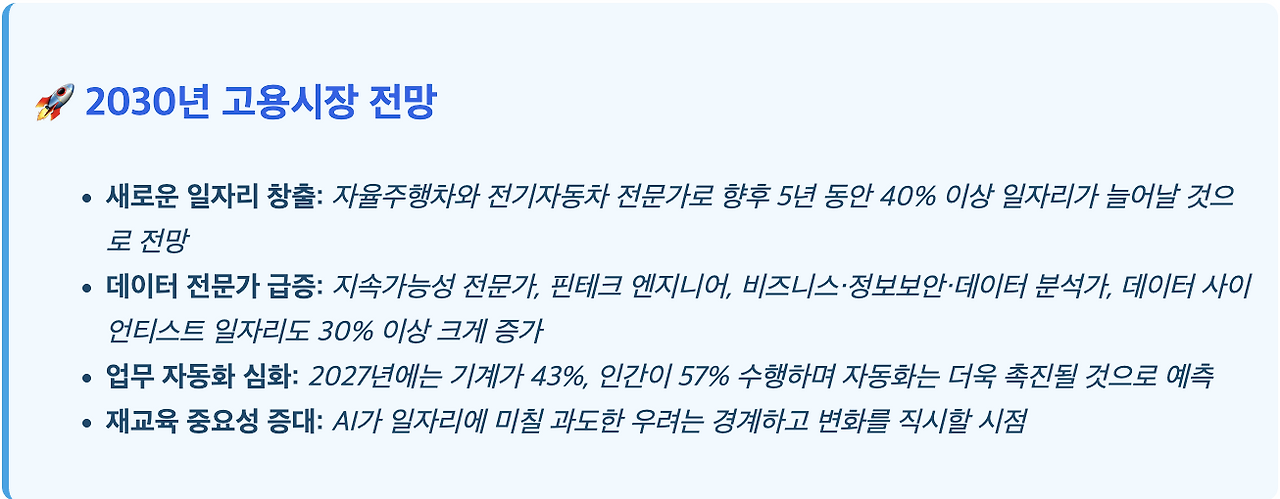 AI와 머신러닝 전문가 수요도 35% 이상 증가할 것으로 예측되며, 새로운 형태의 일자리들이 등장할 것으로 전망됩니다.