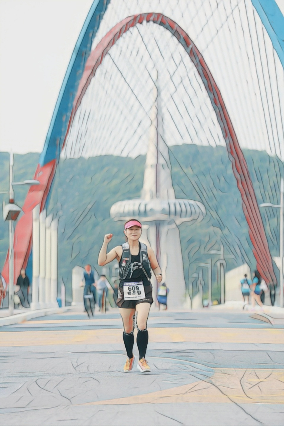 마지막 CP에서는 주먹밥을 먹었다. 밥과 김만으로만 된 주먹밥이었지만 왜 그렇게 맛있었을까. 세상에서 음식을 가장 맛있게 먹는 방법은 달리기 중 허기진 몸으로 먹는 방법이 있을 것이다. 나는 주먹밥이 너무 맛있다며 주먹밥을 입에 넣었다. 기억은 항상 미화되는 법이지만, 그렇게 추하지는 않았을 것이라고 생각한다. 난 50km를 한 일곱 번쯤 참가한 사람처럼 여유롭게 먹었다고 나의 기억은 그렇게 그리고 있다. 마지막 CP는 지나가기가 아쉬웠다. 다음은 없기 때문이다. 그렇지만 다른 사람들은 쿨하게 물만 마시고 지나가기도 했다. 나보다 늦게 도착한 여자러너분이 주먹밥을 먹지 않고 물만 마시고 뛰어갔다. 내가 먹는 동안 나를 앞질러 뛰어가는 사람들을 보면 마음이 급해진다. 나도 그만 먹고 이제 뛰기로 한다. 이제는 많이 먹어도 배가 안 아팠다. 나의 몸이 계속해서 움직이니까 나의 장기들도 움직이지 않는가 보다 생각을 하면 뛰었다. 저녁이라 길이 잘 안 보일뿐더러 나도 길을 몇 번 잃어버릴 뻔했는데, 앞에서 뛰어가던 여자분도 길을 헷갈려하며 멈추기도 했다. 그래서 제법 되는 거리를 따라잡을 수 있었다. 울트라 마라톤은 모두를 동지로 만든다고 했다. 나와 같이 달리고 있는 선수들은 경쟁자가 아니라 동지이다. 그분과 함께 이야기를 나누면서 갔다. 그분 덕분에 페이스를 잘 유지할 수 있었던 것 같다. 한 7~8 Km를 남겨 놓고 그분과 함께 뛰었는데, 함께 뛰는 것은 고통이나 외로움을 반으로 나누는 것 같았다. 함께 뛰는 것만으로도 그렇게 힘이 많이 되다니... 어디에서 왔는지, 달리기를 한지는 얼마나 되었는지, 최고기록은 얼마인지를 알게 되었고, 50Km에 참가하게 된 계기도 알게 되었다. 다리는 뻐근하고 무거우며, 앞으로 남은 거리는 멀고, 뛰어도 뛰어도 거리는 줄어들지 않는 것처럼 느껴졌지만, 그렇게 같이 달리다 보니 멀리 있는 엑스포 다리가 보였다. 눈에 보이지만 신기루처럼 거리가 좀처럼 좁혀지지 않았다. 50Km를 거의 다 뛰어갈 때쯤 100Km를 생각했다. '이걸 한번 더 뛰어야 한다고...?" 그렇지만 사람은 망각의 동물이고, 마음을 먹는 것이 무섭다. 항상 그렇듯, 100Km를 달린다고 생각하면 50Km를 다 와갈 때는 지금처럼 힘들지 않을 것이라는 것을 알고 있다.