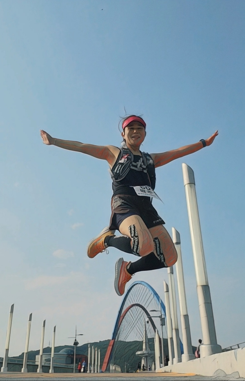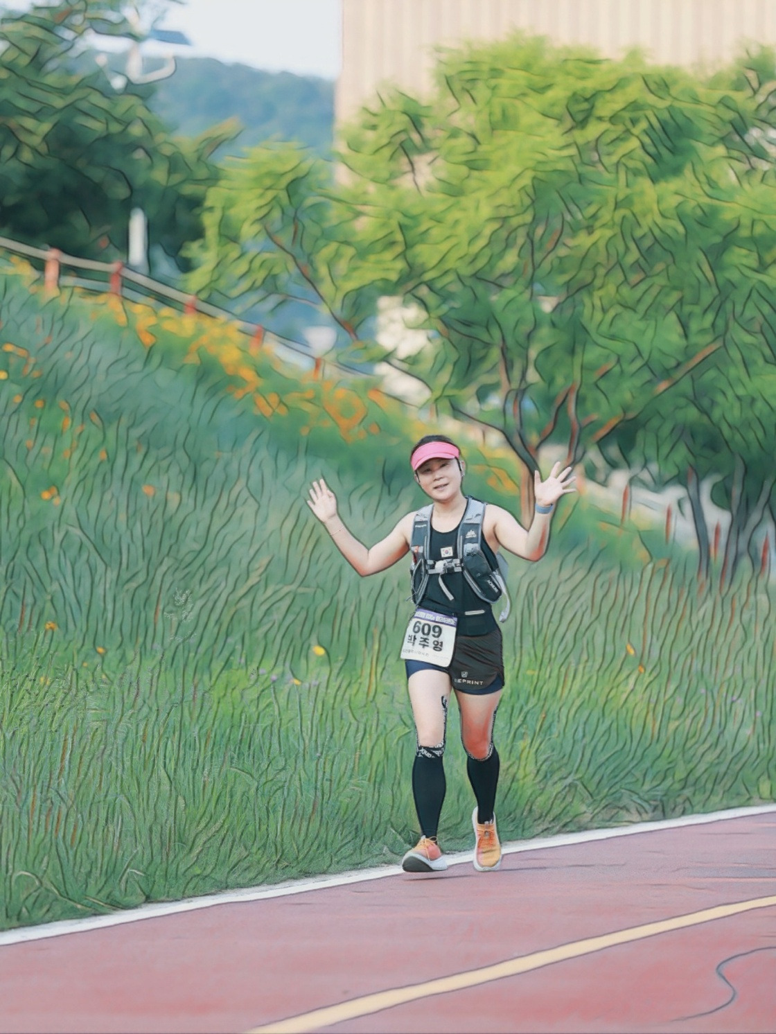 대회 측에서 시작 전 뽀송뽀송하고 제정신일 때 사진을 찍어야 한다고 컨셉사진을 찍어주셨다. 울트라 마라톤의 좋은 점은 오르막이 나오면 무조건 걷는다는 것이다. 다른 사람들이 조금의 오르막이라도 나오면 다 걸으니 나도 걷고 싶었다. 사실 나는 50km라서 뛸 수 있을 정도의 경사였지만(여수 마라톤에 비하면 경사도 아니었다. ) 오르막길은 걷고 싶은 마음을 실행에 옮기기에 너무나 바람직한 명분이었다. 20km 이후로는 걷고 싶다는 마음과 뛰어야 한다는 마음의 싸움이었던 것 같다. 그래서 뛰면서 규칙을 정하기로 했다. 오르막은 걷자. 앞에 차가 오면 걷자(위험하니까). 주로가 너무 안 좋으면 좀 걷자. 물 마시고 싶을 때는 좀 걷자. 이렇게 정하고 나니까 걸어야 될 타이밍이 분명해졌다. 그래서 오르막길이 나오면 너무 반가웠다. 일반 마라톤에서는 오르막 트라우마가 있는 사람처럼 질색을 하지만, 울트라 마라톤에서는 오르막이 이렇게 반가울 줄이야. 사실 풀코스 마라톤보다 조금 더 먼 50km를 달릴 뿐인데, 사람 마음이 이렇게 간사해진다.