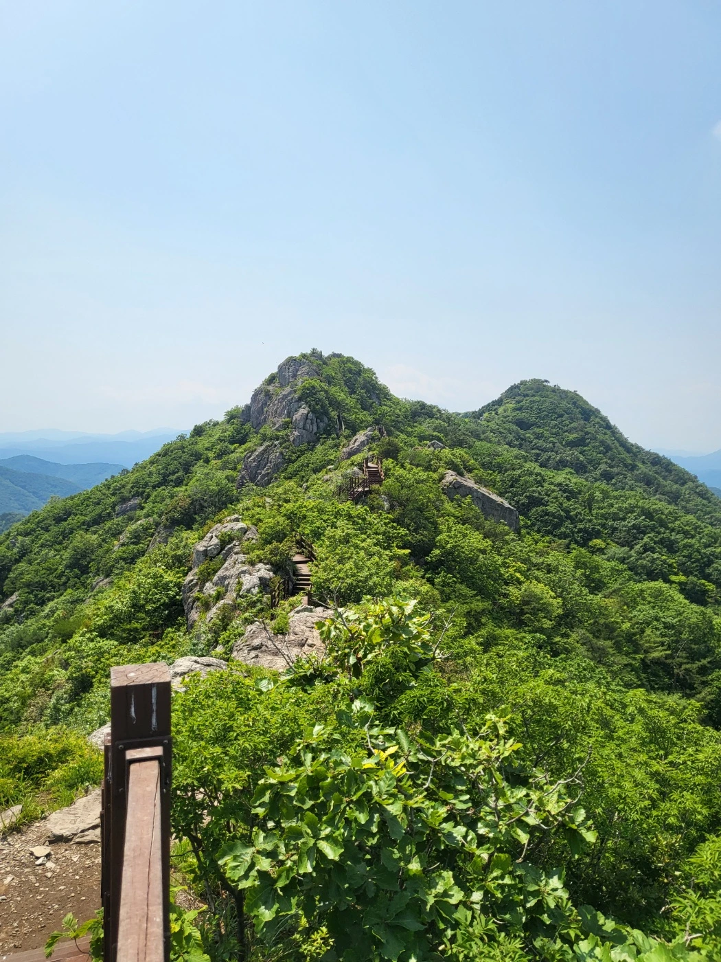 정병산 꼭대기에 5시가 되기 전에 도착했다. 항상 올라가는 길은 숨이 막혀 죽을 것 같아도 산꼭대기 바람은 상쾌하다. 그렇게 산 정상에 올라가자마자 망각세포들이 열심히 일하여 5분까지만 해도 '내가 이걸 왜 하고 있지? 다시는 안 해!' 라며 기어올라오던 몸뚱이는 시원한 풍경과 살에 닿는 바람으로 인해 '이 맛에 등산하는 사람'이 된다. 하지만 나에게는 아직 8개의 봉우리가 남아 있었다. 정상을 올랐다는 기쁨보다 잠깐이라도 사진 찍고 쉴 수 있다는 것에 안도감을 느꼈다.