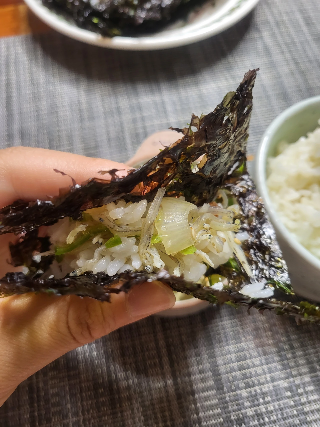 왼: 밥과 함께 먹는 고춧물. 사실 고추와 멸치를 좀 더 잘게 다져야 하고 국물도 자작해야 한다. 그래야 진짜 고춧물인데, 잘못만든것 같다. 오; 그래도 맛있다. 김에 싸먹는다.