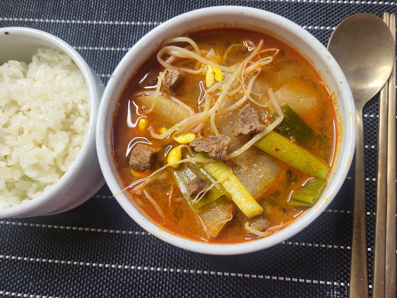 빨간 육개장이랑 다른 점이 있다면 육개장은 고기 육수를 베이스로 끓인다. 하지만 소고깃국은 무와 여러 가지 채소 베이스 육수맛이다. 그래서 좀 더 기름진 맛이 덜하다. 육개장은 더 강한 양념의 맛이라면 빨간 소고깃국 더 담백하고 시원한 맛이 난다.덩어리 소고기를 먹는 것보다 소화도 더 잘된다.