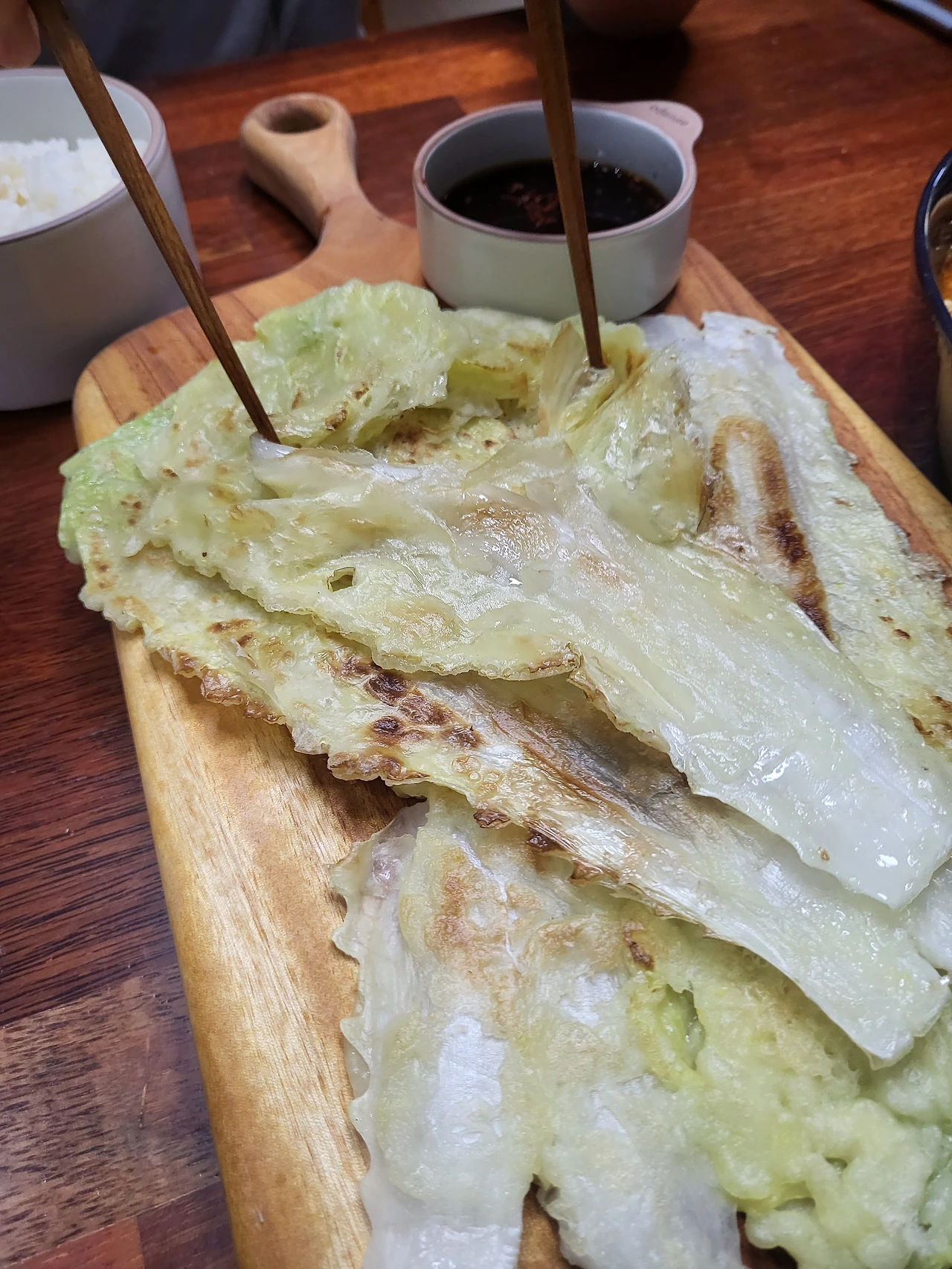 양념장은 보통 간장과 식초, 고춧가루 세 가지를 합한 양념장이 기본이다. 너무 간단해 보이고 단순해 보이지만 이 단순한 맛에서 벗어나지 못한다. 배추전을 쭉쭉 짖고 양념장에 찍어서 한입 가득 넣어 씹는다. 배추줄기의 달큰함과 아삭함과 함께 얇은 배춧잎에 가득 뭍은 밀가루와 기름의 고소함까지 한입에 느껴야 한다. 작게 잘라서 넣어도 별맛이 없다. 내 경험상 한입 가득 넣고 먹어야 맛있다. 술을 별로 안 좋아하지만 한겨울, 차가운 막걸리가 당기는 그런 맛이다.